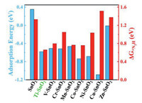 | Fig. 1. The calculated N2 adsorption energies (in blue) and the Gibbs free energy changes of the first hydrogenation step (ΔG*N2H, in red) of transition metal-doped SnO2. | |