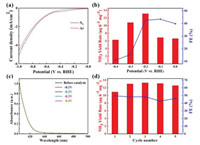 | Fig. 4. The electrochemical NRR performance of Ti-doped SnO2. (a) LSV curves in Ar- and N2-saturated 0.1 mol/L Na2SO4. (b) NH3 yield rates and Faradaic efficiency at different applied potentials. (c) Chronoamperometry curves for N2H4 at different applied potentials. (d) Recycling tests at −0.2 V vs. RHE. | |