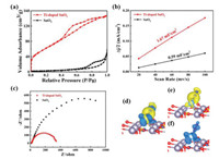 | Fig. 5. (a) Nitrogen sorption isotherm, (b) the electrochemical double-layer capacitance analysis at −0.25 V, and (c) EIS analysis of SnO2 and Ti-doped SnO2. (d) Difference charge density of N2 adsorbed on Ti-doped SnO2 with positive (e) and negative (f) charges represented in yellow and blue, respectively. | |