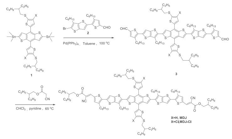 The synthetic route of the molecules MDJ-Cl and MDJ are illustrated in Fig. 1, and the detailed synthesis process can be seen in Supporting information. Small molecule donors, MDJ and MDJ-Cl were synthesized by Stille coupling and Knoevenagel condensation in sequence. The molecular structures of MDJ and MDJ-Cl are confirmed by 1H NMR, 13C NMR and mass spectra. Both MDJ and MDJ-Cl display an excellent solubility in common solvents such as dichloromethane, chloroform, chlorobenzene, tetrahydrofuran and toluene due to the multiple alkyl chains. Thermal gravimetric analysis (TGA) indicates that the two materials have good thermal stabilities with 5% weight loss decomposition temperatures of 359.8 ℃ for MDJ-Cl and 354.6 ℃ for MDJ, respectively (Fig. S8 in Supporting information).