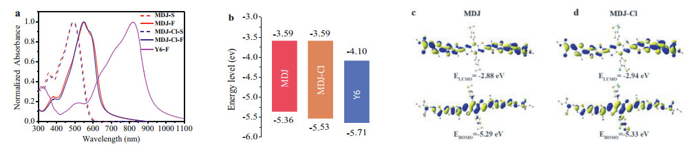 | Fig. 2. (a) Normalized absorption spectra of MDJ, MDJ-Cl and Y6 in the CHCl3 solution and thin film. (b) Energy level diagram of materials used in the device. Electron density distributions of LUMO and HOMO for (c) MDJ and (d) MDJ-Cl. | |