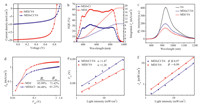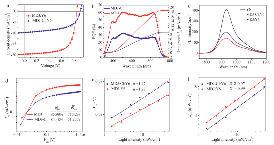 | Fig. 3. (a) The J-V curves and (b) EQE curves of the champion solar cells based on MDJ: Y6. MDJ-Cl: Y6 prepared under the optimal conditions. (c) Photoluminescence spectra of the Y6 neat film and the blend film (MDJ: Y6; MDJ-Cl: Y6) excited at 639 nm. (d) Photocurrent density (Jph) versus effective voltage (Veff) curves of the devices. (e) Voc-light intensity and (f) Jsc-light intensity relationships. | |