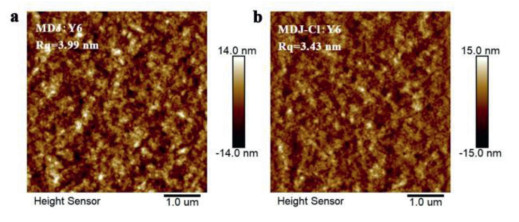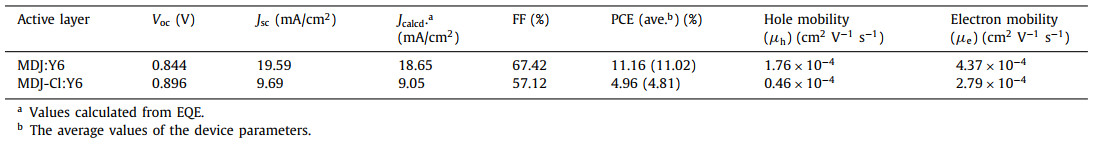 In order to investigate the photovoltaic performance of the two donor materials, OSCs with a traditional device structure of ITO/PEDOT: PSS/small molecular donor: Y6/PDINO/Al were fabricated. The detailed process of device preparation is described in the supporting information. The optimized device used chloroform as the solvent, and were heat-annealed at 100 ℃ for 10 min. The weight ratio of D/A was 1.5:1, with a total concentration of 20 mg/mL. The current-voltage curves of the optimal OSCs are showed in Fig. 3a, and Table 1 shows the corresponding photovoltaic parameters. The device based on MDJ-Cl revealed a Voc of 0.896 V, a Jsc of 9.69 mA/cm2, an FF of 57.12% and ultimately a modest PCE of 4.96%. In contrast, the MDJ based device showed an excellent PCE of 11.16% with a Voc of 0.844 V, a significantly increased Jsc of 19.59 mA/cm2 and an FF of 67.42%. The different Voc values of the two devices can be attributed to their HOMO levels. Fig. 3b shows the external quantum efficiency (EQE) curves of the best MDJ/Y6 and MDJ-Cl/Y6 co-blended films. The MDJ/Y6 blend covers a broader and stronger photoresponse range from 300 nm to 935 nm. The maximum EQE of the best MDJ/Y6 blended film is 60% at 500 nm, which is 1.9 times higher than that of the optimal MDJ-Cl/Y6 blended film. This agrees with the higher Jsc values of MDJ/Y6 blends. By integrating the EQE data, the Jsc values for the MDJ and MDJ-Cl based OSCs were calculated to be 18.65 mA/cm2 and 9.05 mA/cm2, respectively. The integral Jsc values calculated from the EQE curves matched well with the Jsc values obtained from the J-V curves (error < 5%).