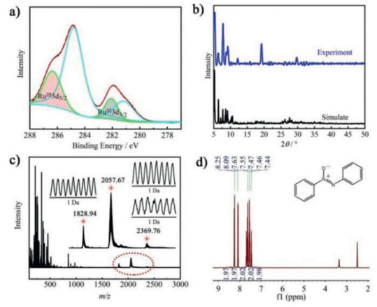 | Fig. 2. (a) XPS spectra for Ru 3d of NaH11·1·53H2O. (b) PXRD pattern of NaH11·1·53H2O. (c) Negative ESI-MS spectrum of NaH11·1·53H2O in methanol. (d) 1H NMR spectra for 2a (500 MHz, DMSO). | |