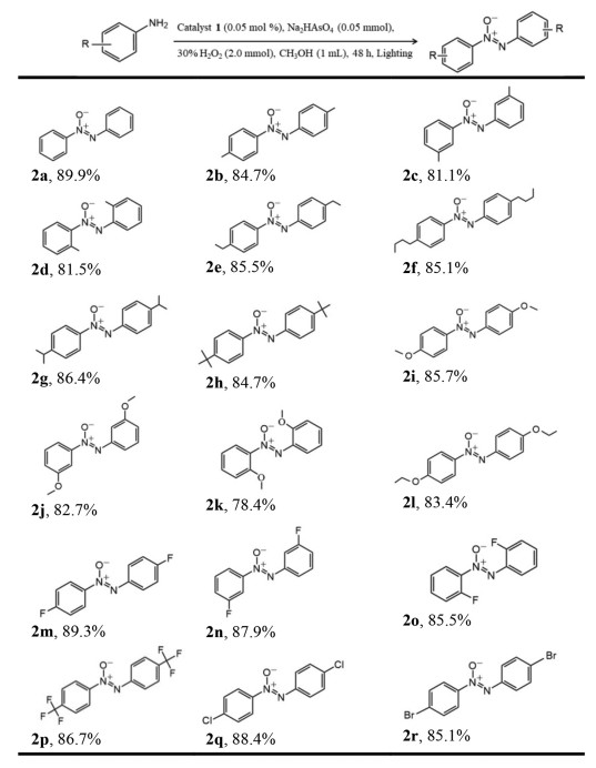 Azoxybenzene compounds, as important chemical intermediate, have found tremendous applications in organic synthesis industry as organic dyes, photochemical switches, pharmaceuticals and food additives [33-35]. Aiming to prepare the valuable azoxybenzene derivatives, phenylamine was preferred as a model substrate to exploring ideal reaction conditions for the Ru-containing POM photocatalyzed oxidative coupling of aromatic amines in an environmentally greener processes. By employing 0.05 mol% of NaH11·1·53H2O in the presence of 2.0 mmol of H2O2 (30% in H2O2) in methanol for 48 h under 10 W LED exposure, we were surprised to found the formation of azoxybenzene as the target product with 80% yield (Table S6 in Supporting information). To produce more valuable target product with high selectivity, it is necessary to investigated various additives, such as Na2CO3, NaHCO3, K3PO4, Na2SO4, Na2SO3, Na2S2O4, Na2S2O8, As2O3, NaAsO2 and Na2HAsO4 (Table S6). Obviously, when 0.05 mmol of Na2HAsO4 was used, a significant amount of azoxybenzene (94.2% yield) was observed (Table 1, entry 1). This oxidative coupling reaction was accelerated slightly by increasing the molar weight of photocatalyst, then the ideal dosage could be locked in 0.05 mol% of NaH11·1·53H2O (Table S6). The photocatalyzed oxidative reaction worked in a variety of organic solvents (toluene, acetonitrile, dimethyl formamide, dichloromethane, methyl tert‑butyl ether, ethanol, methanol), in which methanol giving the highest yield and selectivity (Table S7 in Supporting information). The HR-ESI-MS analyses were used to study catalyst stability, and three prominent peaks at m/z = 1828.94, 2057.67, and 2369.76 were assigned to the [H3(RuO6)2(AsW9O33)6{(W6O3)2(H2O)12}]9− (simulated 1828.92), [H4(RuO6)2(AsW9O33)6{(W6O3)2(H2O)12}]8− (simulated 2057.66) and [H5(RuO6)2(AsW9O33)6{(W6O3)2(H2O)19}]7− (simulated 2369.77), clearly proves the stability of the complete anions groups of NaH11·1·53H2O in methanol (Fig. 2c). Interestingly, performing the single catalyst, such as Na2WO4, As2O3 and RuCl3, was also observe to promote the oxidative coupling reactions (Table 1, entries 2–4), however with pessimistic efficiency. No desired target product was detected in the absence of catalyst NaH11·1·53H2O under light irradiation (Table 1, entry 5). Besides, the photocatalytic coupling reaction was thoroughly lose efficacy when O2 or N2 were chosen as the replacement of H2O2, which indicates the hydrogen peroxide play a significant role in this reaction system (Table 1, entries 6 and 7). Furthermore, omitting the light from the reaction system led to a significant change in the reaction outcome (Table 1, entry 8). This result clearly confirmed that the transformation of phenylamine to azoxybenzene proceeded via a photocatalytic process. However, the photocatalytic activity was no considerable improvement in the transformation of the substrate as the temperature change from 30 ℃ to 50 ℃ (Fig. S9 in Supporting information). It further proved that the reaction was implemented by the light-driven rather than thermally driven. After comprehensive optimization with the relevant reaction parameters (Tables S6 and S7), we were delighted to found that 0.05 mol% NaH11·1·53H2O, with 0.05 mmol of Na2HAsO4 and 2.0 mmol of H2O2 as oxidant in 1 mL methanol under light irradiation was the ideal photocatalytic reaction condition (Table 1, entry 1).
