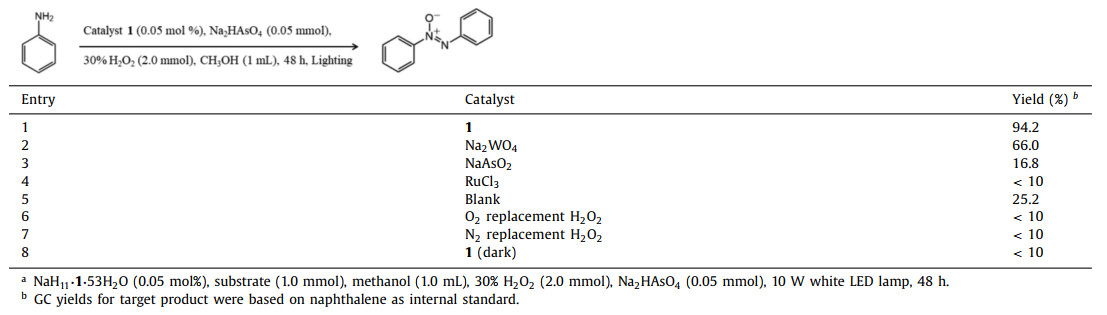 Fortunately, a novel Ru2W12-cluster bridged tungstoarsenate, NaH11[(RuO6)(AsW9O33)3{(W6O3)(H2O)6}]2 53H2O (NaH11·1·53H2O), have been synthesized. NaH11·1·53H2O have the large Ru2W12 cluster and show the largest structure in all the Ru-containing POMs up to date, in which the Ru2W12-cluster was tightly trapped by six same units of B-β-AsW9O33 (Figs. S2 and S3 in Supporting information). Most interestingly, the photocatalysis oxygenation coupling reaction of anilines be selected as model substrates due to the important application prospects in chemical industry [22, 23]. Results indicate that NaH11·1·53H2O is an effective photocatalyst for the preparation of azoxybenzenes from anilines with excellent yields and high selectivity. We infer the inherent redox property of oxygen-rich POMs surfaces and high photocatalytic activity of the Ru-containing metal cluster imbedded in NaH11·1·53H2O provide a sufficient driving force for the photocatalytic transformation from anilines to azoxybenzenes, which can be verified by our experiments results and the fact that hardly target products are rapidly oxidized under light irradiation in the absence of photocatalysts.