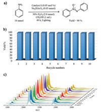 | Fig. 3. (a) The large-scale experiment in presence of 0.05 mol% catalyst NaH11·1·53H2O. (b) Recycling experiments of NaH11·1·53H2O for the oxidation of anilines. (c) Time-resolved stability of the compound NaH11·1·53H2O in methanol. | |