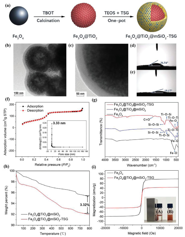 | Fig. 1. (a) Synthesis flow chart of Fe3O4@TiO2@mSiO2-TSG; (b, c) TEM images of Fe3O4@TiO2@mSiO2-TSG; water contact angles of (d) Fe3O4@TiO2@mSiO2 and (e) Fe3O4@TiO2@mSiO2-TSG. (f) Nitrogen adsorption-desorption isotherms and pore size distribution curve of Fe3O4@TiO2@mSiO2-TSG. (g) FT-IR spectra of Fe3O4, Fe3O4@TiO2@mSiO2, Fe3O4@TiO2@mSiO2-TSG. (h) TGA curves of Fe3O4@TiO2@mSiO2 and Fe3O4@TiO2@mSiO2-TSG. (i) Magnetic hysteresis curves of Fe3O4 and Fe3O4@TiO2@mSiO2-TSG, the inset in (i) shows (A) the magnetic separation and (B) dispersion processes of the Fe3O4@TiO2@mSiO2-TSG. | |