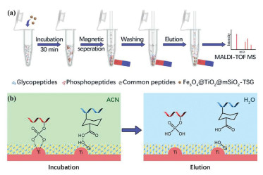 | Fig. 2. (a) Workflow chart of Fe3O4@TiO2@mSiO2-TSG for glycopeptide enrichment from biological samples; (b) binding modes between glycopeptides/phosphopeptides and functional groups of Fe3O4@TiO2@mSiO2-TSG in different conditions. | |