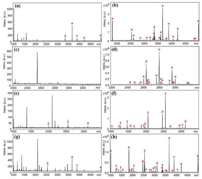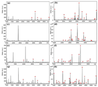 | Fig. 3. MALDI-TOF MS spectra of 100 nmol/L tryptic digests of (a, b) HRP, (c, d) IgG, and (e, f) β-casein, as well as (g, h) mixed HRP and β-casein. (a, c, e, g) direct analysis; (b, d, f, h) after enrichment by Fe3O4@TiO2@mSiO2-TSG. "△", glycopeptides; "*", glycopeptide fragments; "#", phosphopeptides; "§", phosphopeptide fragments. | |