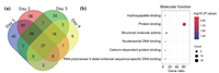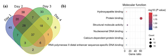 | Fig. 4. (a) Venn diagram of the identified glycopeptides and phosphopeptides of the healthy volunteer in four days; (b) the gene ontology (GO) term enrichment analysis of the molecular function of the healthy volunteer. | |