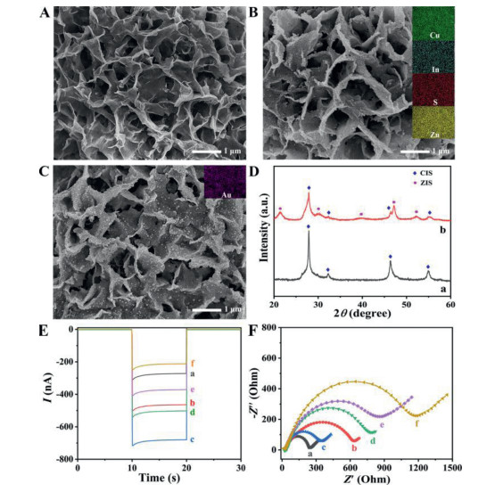 | Fig. 1. SEM images of the (A) CIS electrode, after with (B) ZIS nanocrystals deposition, and (C) Au nanoparticles decoration; (D) XRD patterns of CIS and ZIS/CIS. (E) Current outputs and (F) impedance spectra of (a) the CIS electrode, after with (b) ZIS deposition, (c) Au decoration, (d) Ab immobilization, (e) peptide anchoring, and (f) finally target Ag incubation. Insets in B and C: elemental mappings of (Cu, In, S, and Zn) and (Au). | |