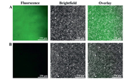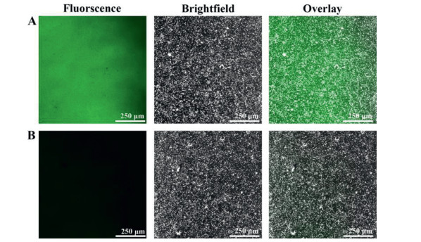 | Fig. 2. Fluorescence images of the (A) Ab/Au/ZIS/CIS, and (B) ZP/Ab/Au/ZIS/CIS electrodes after with incubation of 2.0 mg/mL FITC-BSA. ZP denotes zwitterionic peptide. | |