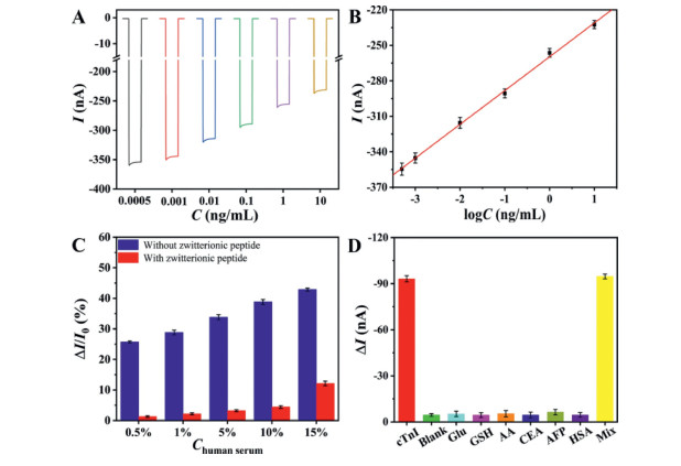 | Fig. 3. (A) Current signal and (B) calibration curve of the PEC immunosensor to different concentrations of target cTnI; (C) current change rate (ΔI/I0) of the immunosensor with and without zwitterionic peptide after underwent incubation in a diluted human serum; (D) current change (ΔI) of the immunosensor against 0.1 ng/mL of cTnI, 5 mmol/L of Glu, GSH, AA, 0.5 ng/mL of CEA, AFP, HSA, and the mixture of all (Mix). ΔI = I0 − I, I and I0 stand for current signal of the immunosensor after (I) and before (I0) incubation. | |