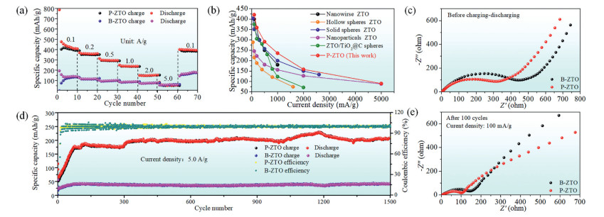 Moreover, as shown in Fig. 1d, in the long-term cycle process at the high current density of 5000 mA/g, although the coulombic efficiencies are quite similar, the capacity of P-ZTO is stable to be 209 mAh/g after 1500 cycles, which is much higher than that of B-ZTO sample (50 mAh/g). What is more, the EIS analysis are shown in Figs. 1c and e. The result shows that the electrolyte resistance of two samples is similar, while P-ZTO has significantly lower charge transfer resistance than that of B-ZTO [23]. Since the gap between particles is an important factor affecting the charge transfer resistance, we analyzed that the lower impedance of P-ZTO is due to its special porous plate structure. The charge can be rapidly transmitted on the flat surface of the P-ZTO. While as B-ZTO is composed of bulks, there is a large gap between each bulk, which is not conducive to charge transmission. These results indicate that besides the high capacity, P-ZTO also possesses high cycle stability at high current density, manifesting its potential for practical application, especially in quick charge for electric vehicles.
