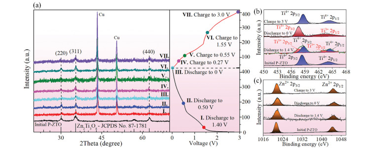 | Fig. 2. (a) XRD pattern of the P-ZTO at the different charging-discharging stages. The XPS spectra of Ti (b) and Zn (c) elements at different charging-discharging stages of P-ZTO. | |