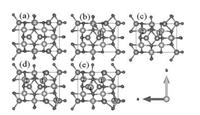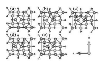 | Fig. 3. Ground-state structures of xZn2Ti3O8 with x = 0, 1, 2, 3 and 4 from (a) to (e). (Green ball: Li, red ball: O, blue ball: Ti, gray ball: Zn). | |