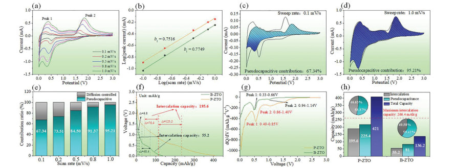 | Fig. 4. Cyclic voltammetry of P-ZTO at different scan rates (a) and corresponding peak current versus square root of scan rates (b). Pseudocapacitance contribution ratio of P-ZTO at scan rates of 0.1 mV/s (c), 1.0 mV/s (d) and their summary histogram (e). Capacity voltage curve and intercalation capacity calculation at 100 mA/g of two ZTO (f). The dQ/dV curve analysis of two ZTO (g). Total capacity and capacity contribution of each lithium storage behavior (h). | |