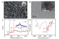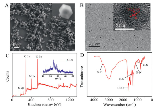 | Fig. 1. (A) ZIF-8 SEM image. (B) CDs TEM image (inset: the crystalline morphology of CDs). (C) CDs XPS spectrum for full region (inset: the XRD pattern of CDs). (D) CDs FT-IR spectrum from 500 cm−1 to 4000 cm−1. | |