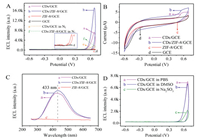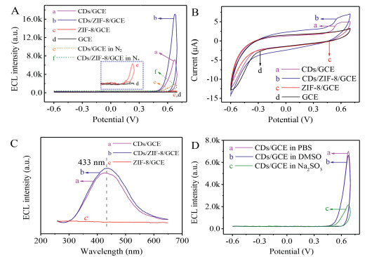 | Fig. 3. (A) ECL-potential curves of (a) CDs/GCE, (b) CDs/ZIF-8/GCE, (c) ZIF-8/GCE, (d) GCE in PBS, (e) CDs/GCE, (f) CDs/ZIF-8/GCE in N2-saturated PBS. (B) CV curves of (a) CDs/GCE, (b) CDs/ZIF-8/GCE, (c) ZIF-8/GCE, (d) GCE in PBS. (C) 2D ECL spectra of (a) CDs/GCE, (b) CDs/ZIF-8/GCE, (c) ZIF-8/GCE in PBS. (D) ECL-potential curves of CDs/GCE in 0.1 mol/L PBS (a), 0.1 mol/L PBS containing 10 mmol/L DMSO (b) and 0.1 mol/L PBS containing 10 mmol/L Na2SO3 (c), respectively. All ECL and CV scanning voltage was −0.6~0.7 V. | |