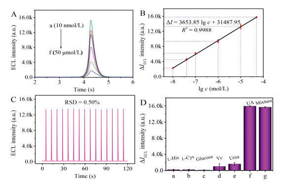 | Fig. 4. (A) ECL response signals of the prepared biosensor to different concentrations of UA from 10 nmol/L to 50 µmol/L (a-f). (B) Corresponding calibration curve for the UA determination. (C) Stability of CDs/ZIF-8/GCE containing 50 nmol/L UA in PBS (pH 7.4). (D) Selectivity of UA biosensor, the concentration of the above interference agents at 5 mmol/L, including l-arginine (l-His), l-cysteine (l-Cys), glucose, l-ascorbic acid (Vc), urea and 50 µmol/L of UA. ECL responses were all measured with potential of −0.6~0.7 V in 0.1 mol/L PBS (pH 7.4), scan rate of 0.3 V/s, PMT biased 800 V and magnitude 4. | |