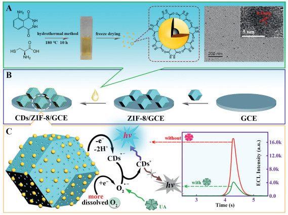 In this work, through the combination of pre-placement strategy to CDs and "pore confinement-enhanced ECL" effect, an efficient and concise ECL system based on CDs assembled ZIF-8 had been constructed skillfully, which decreased excitation potential effectively, and enhanced notably the luminescence intensity and stability of CDs (Scheme 1). Firstly, the CDs were prepared with the hydrothermal synthesis by using luminol to provide abundant hydrazide modified surface groups, l-cysteine to supply N and S doping sources, achieving low excitation potential and high ECL intensity (Scheme 1A). Then, the CDs were assembled into ZIF-8 via π-π stacking and hydrogen bonding as driving forces, which increased the immobilization amount and stability of CDs (Scheme 1B). More importantly, ZIF-8 could preconcentrate dissolved O2 through the porous structure and promote the productivity of ROSs in virtue of the abundant existence of pyridine nitrogen in framework, achieving the construction of the efficient and concise CDs-based exogenous coreactant-free ECL biosensors. As a proof of concept, the constructed ECL platform was highly sensitive for the detection of uric acid (UA) with a low detection limit of 3.52 nmol/L ranging from 10 nmol/L to 50 µmol/L. This work expanded ideas for the application of pore confinement effect and provided references for the detection of disease biomarkers of gout and hyperuricemia.