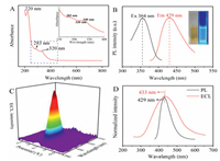 | Fig. 2. Characterization of CDs with (A) UV-vis absorbance (the inset corresponding to the local magnification UV-vis absorbance) and (B) PL spectra (Ex, black line, Em, red line), the inset photograph of B is under daylight (left) and UV light (right). (C) 3D ECL image pattern and (D) normalized PL spectrum (black line) and 2D ECL spectrum (red line). | |