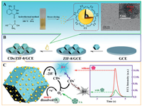 Despite the ECL binary system consisted of the luminophor and coreactant has excellent ECL intensity and efficiency, the addition of exogenous coreactants, such as hydrogen paroxide (H2O2), tri-n-propylamine (TPrA) and peroxydisulfate (S2O82−), suffers from toxicity and poor stability in aqueous solutions [12-14]. Unlike classical exogenous coreactants, dissolved O2 exhibits distinctive advantages, including biocompatibility, low toxicity and without involving any extra addition, making it as an extremely promising coreactant. Nevertheless, its low reactivity for reactive oxygen species (ROSs) generation has been the notable drawback in its biosensing application [15]. Therefore, it is a critical step to increase the production of the ROSs from dissolved O2 in the construction of exogenous coreactant-free biosensing platform. In our previous work, covalent organic frameworks (COF) could be used as ECL micro-reactors [16] to achieve significantly enhanced ECL in tris(2, 2′-bipyridyl) ruthenium(Ⅱ)/TPrA system (Ru(bpy)32+/TPrA), because the TPrA as exogenous coreactant could be in situ readily reduced to the active TPrA• in the porous nanochannels of COF by means of the pore confinement effect [11]. Recently, with the in-depth researches on organic frameworks materials, metal-organic frameworks (MOF) [17, 18] with highly ordered channels assembled by metal ions and organic/inorganic ligands has shown a spectacularly catalytic effect on dissolved O2 efficiently. For instance, zeolitic imidazolate framework-8 (ZIF-8), as a rhombic dodecahedron MOF, was demonstrated that it met the prerequisite for efficient catalytic reduction of dissolved O2 for its abundant pyridine nitrogen (C−N bond) [19]. Inspired by this, we inferred that ZIF-8 could emerge as a promising candidate in constructing exogenous coreactant-free biosensor platform owing to the increased production of the ROSs. Herein, ZIF-8 could not only provide the confined spaces to pre-concentrate dissolved O2 for the pore confinement effect, but also had a significant effect on catalytic reduction of dissolved O2 for the existence of abundant C−N bond. To sum up, ZIF-8 furnished a favorable matrix for building efficient and concise CDs based-ECL biosensors.