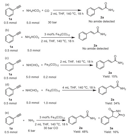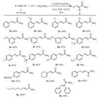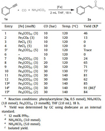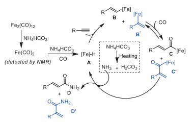 In summary, we have demonstrated the first example of ligand-free iron-catalyzed hydroaminocarbonylation of alkynes synthesis of linear α, β-unsaturated primary amides using NH4HCO3 as the ammonia source. In the presence of NH4HCO3 and non-noble Fe3(CO)12 serving as catalyst, a variety of alkynes, including aromatic alkynes, aliphatic alkynes, terminal alkynes, internal alkynes, were transformed into the desired linear α, β-unsaturated primary amides in good to excellent yields. The applicability of this methodology has been demonstrated by synthesis of α, β-unsaturated amides bio-active compound. Preliminary mechanistic studies reveal the activation model involving interactions of NH4HCO3 with Fe3(CO)12. Further investigations are currently underway to apply the method to other reactions.