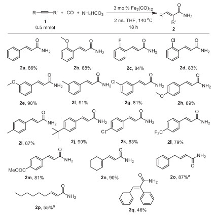 | Scheme 2. Substrate scope for hydroaminocarbonylation of alkynes using NH4HCO3. Reaction conditions: alkyne (1, 0.5 mmol), CO (30 bar), NH4HCO3 (5.0 mmol), Fe3(CO)12 (0.015 mmol), THF (2.0 mL), 140 ℃, 18 h, isolated yield. a Yield was determined by GC using dodecane as an internal standard. | |