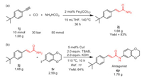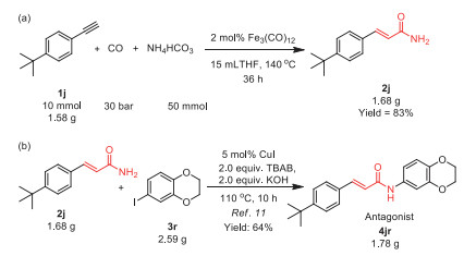To demonstrate the synthetic utility of this method, vanilloid receptor-1 antagonist TRPV-1 was prepared. 3-(4-(tert-Butyl)phenyl)acrylamide 2j preparation proceeded smoothly at gram-scale and 1.68 g of 2j was obtained under the slightly modified reaction conditions in 83% yield (Scheme 3a). The subsequent coupling reaction of 3-(4-(tert-butyl)phenyl) acrylamide afforded vanilloid receptor-1 antagonist TRPV-1 4jr on a gram scale (Scheme 3b) [57].
