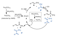 Based on the experimental results and recent experimental data on the hydroaminocarbonylation of alkynes and NH4HCO4 [24-28, 54-56, 58-62], we propose a possible mechanism pathway as shown in Fig. 2. Initially, the active mononuclear iron carbonyl Fe(CO)5 was formed in situ through interactions of Fe3(CO)12 with NH4HCO3. Meanwhile, NH3 and H2CO3 is released through in situ decomposition of NH4HCO3. Then, Fe(CO)5, NH4HCO3 and CO generate the intermediate A. Intermediate A reacts with alkyne to produce intermediate B or B'. The steric hindrance of the terminal alkyne plays the major role for the formation of the kinetically favored terminal alkenyl-iron intermediate B. Subsequent CO insertion forms intermediate C and C', which then affords the final carbonylation product D and D' with the presence of NH3 released from NH4HCO3. Besides, the coordination of alkyne substrates and NH3 with Fe center makes CO insertion and product D formation much more accessible, which is similarly observed in Beller's work using organic amines as the substrates [26].