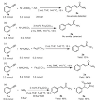 Solid ammonium salts are cheaper and easy-to-handle ammonia source widely applied in aminocarbonylation reactions to produce various amide compounds [47-56]. Recently, we have developed the efficient iron-catalyzed aminocarbonylation of alkynes to produce succinimides with NH4HCO3 [54]. Huang and co-workers developed a palladium-catalyzed aminocarbonylation method for transforming alkenes with NH4Cl into the corresponding amides [55]. Besides, Huang et al. reported a selective palladium-catalyzed hydroaminocarbonylation reaction between alkynes and NH4Cl to branched α, β-unsaturated primary amides [56]. Liu's group reported a hydroaminocarbonylation reaction with alkynes and NH4HCO3 to generate branched α, β-unsaturated primary amides (Scheme 1c) [37]. Nevertheless, developing non-noble metal-catalyzed hydroamin-ocarbonylation with NH4HCO3 for the preparation linear α, β-unsaturated primary amides has not been achieved up to date. Herein, we report the first example of ligand-free iron-catalyzed hydroaminocarbonylation of alkynes to generate linear α, β-unsaturated primary amides using NH4HCO3 as ammonia source (Scheme 1d).