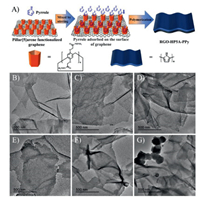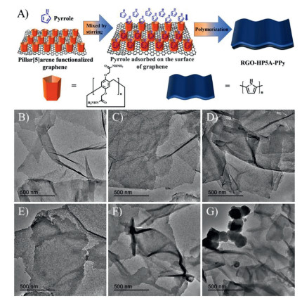 | Fig. 1. (A) Schematic of the synthesis process of RGO-HP5A-PPy composites. TEM images of (B) RGO-HP5A-PPy 1–1, (C) RGO-HP5A-PPy 1–2, (D) RGO-HP5A-PPy 1–3, (E) RGO-HP5A-PPy 1–4, (F) RGO-HP5A-PPy 1–5 and (G) RGO-HP5A-PPy 1–6. | |