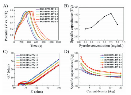 | Fig. 2. (A) Charge-discharge curves (1 A/g) of the electrodes modified of RGO-HP5A-PPy 1–1, RGO-HP5A-PPy 1–2, RGO-HP5A-PPy 1–3, RGO-HP5A-PPy 1–4, RGO-HP5A-PPy 1–5 and RGO-HP5A-PPy 1–6. (B) The specific capacitance of the composites obtained by adding different amounts of pyrrole solution. (C) EIS Nyquist plots of RGO-HP5A-PPy modified electrodes. Inset: a modified Randles' equivalent circuit model applied to fit the impedance data. (D) Specific capacitance at various discharge current densities of RGO-HP5A-PPy composites. | |