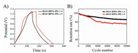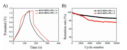 | Fig. 3. (A) Galvanostatic charge and discharge curves at 1 A/g, (B) cycling stability over 10,000 cycles at a current density of 5 A/g of the RGO-HP5A-PPy 1–4//RGO-HP5A-PPy 1–4 and RGO-HP5A-PPy 1–5//RGO-HP5A-PPy 1–5 symmetric supercapacitors. | |