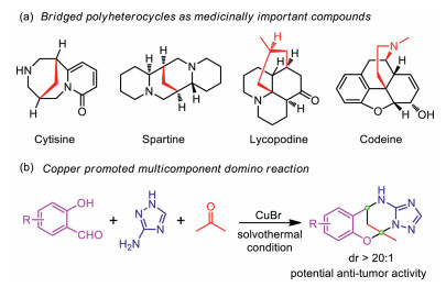 Developing highly efficient chem or stereoselective reactions to access functional molecular scaffolds such as medicinally important compounds or other additional valued chemicals, and in particular, understanding the mechanism of these reactions for a better rational design of matter transformation process represents the holy grail in the research area of modern synthetic chemistry [1-3]. One of the most intriguing aspects in this vein is the multicomponent domino reactions that can transform all the readily available starting materials into the final complexed chemical entities in a one-pot manner, offering exceptional prospects to shape our knowledge of the chemical bond formation and valence theory and the way we fabricate functional chemicals [4-7]. In this context, exploring stereoselective methods for synthesizing bridged compounds particularly the bridged polyheterocycles with multiple stereocenters have attracted widespread interest due to the broad bioactivities of these compounds (Scheme 1a) [8-11]. Conventional methods of preparing these bridged polyheterocycles involve various [n + m] cycloaddition reactions, molecular rearrangement, free radical reactions, transition-metal-catalyzed cyclization reactions, etc., which requires the preparation or adoption of appropriate precursors bearing particular electronic or steric features enabling the subsequent molecular folding or atomic arrangement occurred in a predesigned pathway [12-15]. However, the multicomponent domino reaction may offer an alternative and greener strategy over others because of its outstanding atomic economy, and there is no requirement for the preparation of specific synthons or separation of intermediates during the reaction.