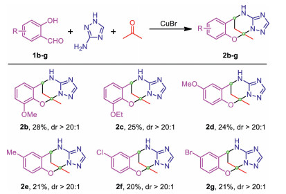 As our long term and continuous endeavors in coordination directed sequential reaction towards functional molecular materials [27-30], we herein report copper promoted diastereoselective Biginelli domino reaction to piece up readily available acetone, salicylaldehyde derivatives and 3-amino-1, 2, 4-triazole affording bridged triazole fused tetrahydroazolopyrimidines bearing multi-stereogenic centers which often prove challenging to install efficiently in the ring (Scheme 1b). Efforts were spent on understanding the reaction mechanism with a combination of crystallography, high-resolution mass spectroscopy, and DFT calculations, thus allowing us to disclose the origin of diastereoselectivity for this domino process. The in vitro anti-tumor activity of these compounds was also evaluated, and the preliminary results showed that compounds 2b and 2d possess relatively high activity against HepG2 tumor cells even at very low concentrations (10 µmol/L). Moreover, tandem mass-spectroscopy was employed to analyze the fragmentation rules of these novel polyheterocycles, providing first-hand information for future possible bioanalytical purposes of rapid identification of these compounds.