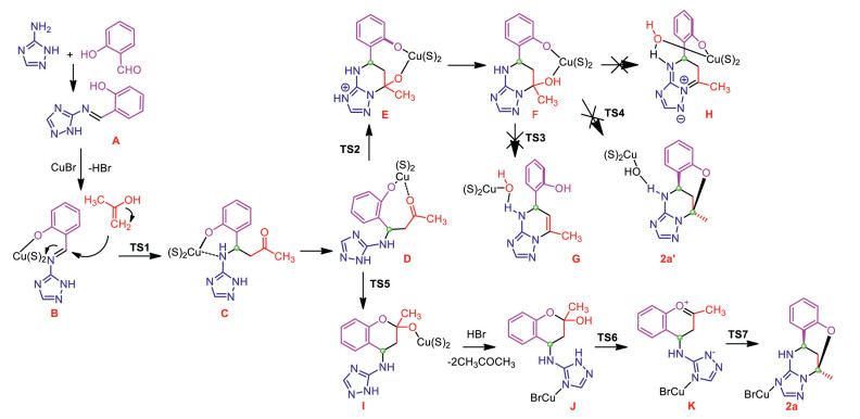 To gain more insight into this multicomponent domino reaction, the time-dependent HRMS technique was utilized to monitor the reaction process [31, 32]. As shown in Fig. 1, at the earlier stage, a peak at m/z 189 appeared, and it could be assigned as the Schiff base product being from the condensation of aldehyde and triazole amine. As the reaction proceeded, the intensity of this peak declined gradually, suggesting the consumption of this Schiff base. Meanwhile, the peak at m/z 247 which was tentatively assigned as three possible intermediates intensified, reaching its maximum at two hours followed by a gradual decrease of signal intensity. The peak at m/z 229 that was assigned as the product showed its maximum intensity at two hours, then decreased gradually and leveled off until the end of the reaction. Thus a plausible mechanism was proposed based on the time-dependent HRMS studies on the reaction process (Scheme 3). The Schiff base A was formed at the initial stage. Because the reaction starting from the Schiff base A and acetone could also generate the product in a separate control experiment, validating the key intermediate role of Schiff base A. From the intermediate D, two reaction pathways were possible: triazole N-addition followed by phenolic O-addition or phenolic O-addition followed by triazole N-addition with respect to the carbonyl in acetone moiety (Scheme 3). However, DFT calculation suggests the former one is highly disfavored due to the higher energy of H and higher activated energies of transition state TS3 and TS4 (Fig. S20 in Supporting information). Instead, the phenolic oxygen was found to be prone to undergo intramolecular carbonyl addition (TS5), and then dehydration occurs assisted by the acidic N-H bond (TS6), followed by a rapid cyclization (TS7) to give the final bridged polyheterocyclic product. Concerning the diastereoselectivity of this domino reaction, the conformation of TS7 provides a clear hint that the configuration of the first imine carbon will dictate the direction from which the subsequent N-addition occurs, i.e., the proton on the imine carbon always favors a syn conformation with respect to the methyl group.