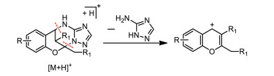 Finally, ESI-MS/MS analysis was performed on all the heterocycles, gaining the information of their fragmentation under the mass spectroscopic condition and thus providing the first-hand fragmentation rules for future rapid structural identification of them when potential biopharmaceutical analysis is needed. It was found that all the heterocycles showed very strong signals for [M + H]+ in the mass spectrum at positive ion mode. Furthermore, MS/MS analysis showed that two C-N bonds between amino-triazole and chromane moiety were labile and could be easily cleaved into characteristic 4H-chromene ions via the loss of one molecule of amino-triazole (Scheme 4, Table S20, Figs. S21–S48 in Supporting information). Meanwhile, the cleavage of two labile C-N bonds from MS/MS results also offers a perspective for us to conduct a retrosynthetic analysis of these novel heterocycles, enhancing our knowledge of the theory of chemical bond-forming and scissoring of them.