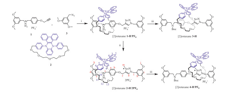 | Fig. 1. The synthesis routes of the [2]rotaxanes. Reaction conditions: (i) Cu(CH3CN)4PF6 (1.1 equiv.), anhydrous dichloromethane, 25 ℃ for 4 h; (ii) CH3I (6.0 equiv.), NH4PF6, methanol, 40 ℃ for 36 h; (iii) Et3N (5.0 equiv.), (Boc)2O (5.0 equiv.), dichloromethane, Ar, 25 ℃ for 12 h. | |