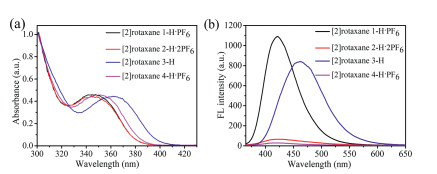 | Fig. 2. The photophysical properties of [2]rotaxanes. UV–vis absorption spectra (a) and fluorescence spectra (b) of target [2]rotaxanes in dichloromethane (pathlength = 10 mm, c = 40 µmol/L, λex = 350 nm). | |