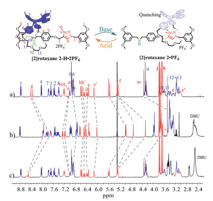 | Fig. 3. (a) Partial 1H NMR (400 MHz, CD2Cl2, 298 K) spectra of [2]rotaxane 2-H·2PF6, (b) [2]rotaxane 2-H·2PF6 after adding 1.2 equiv. DBU, (c) [2]rotaxane 2-H·2PF6 + 1.2 equiv. DBU after adding 1.2 equiv. TFA. | |