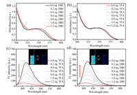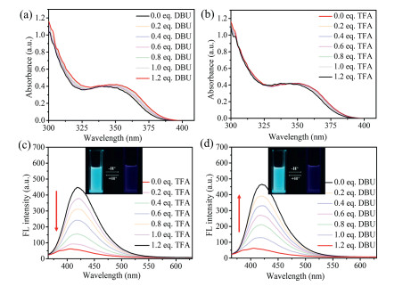 | Fig. 4. The photophysical characteristics of [2]rotaxane 2-H·2PF6 driven by acid-base in dichloromethane. UV–vis absorption spectra (a) and fluorescence spectra (c) of [2]rotaxane 2-H·2PF6 titrated with 1.2 equiv. DBU. UV–vis absorption spectra (b) and fluorescence spectra (d) of [2]rotaxane 2-H·2PF6 + 1.2 equiv. DBU and then adding 1.2 equiv. TFA (pathlength = 10 mm, c = 80 µmol/L, λex = 350 nm). | |
