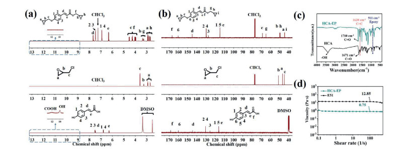 | Fig. 1. (a) 1H NMR and (b) 13C NMR spectra of HCA, ECH and HCA-EP. (c) FTIR spectra of HCA and HCA-EP. (d) Viscosity of HCA-EP and E51 determined from 0.1 s−1 to 500 s−1 at 25 ℃. | |