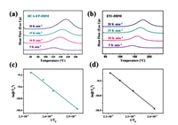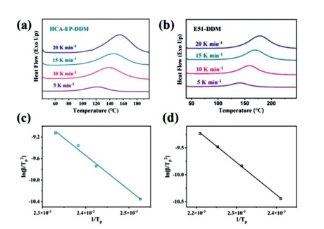 | Fig. 2. Non-isothermal curves obtained from DSC (a) HCA-EP-DDM and (b) E51-DDM via heating rates of 5, 10, 15 and 20 ℃/min. Linear fitting curves of ln (β/Tp2) versus 1/Tp according to Kissinger's equation for (c) HCA-EP-DDM and (d) E51-DDM curing systems. | |