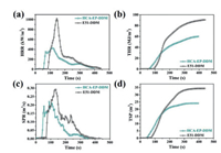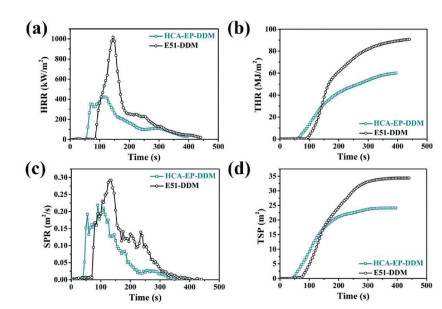 | Fig. 5. (a) HRR, (b) THR, (c) SPR and (d) TSP curves of HCA-EP-DDM and E51-DDM tested by cone calorimeter test. | |