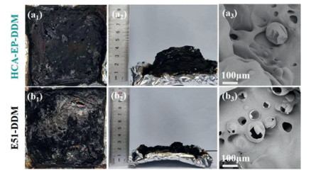 | Fig. 6. Digital photos and SEM morphologies of char residues after cone calorimeter test for (a1–a3) HCA-EP-DDM and (b1–b3) E51-DDM. | |