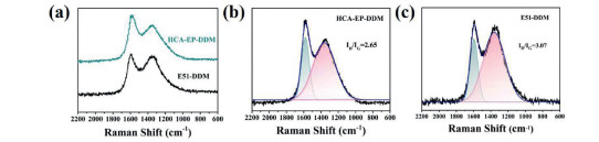 | Fig. 7. Raman spectra of char residues for (a) full survey; peak splitting for (b) HCA-EP-DDM and (c) E51-DDM after cone calorimeter test. | |
