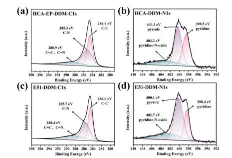 | Fig. 8. The high-resolution XPS spectra for (a, c) C 1s and (b, d) N 1s for char residues of HCA-EP-DDM and E51-DDM after cone calorimeter test. | |